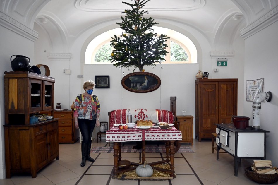 Na snímke riaditeľka múzea Beáta Kereštanová pózuje na výstave s vianočnou tematikou - Kračunska chiža v Múzeu a Kultúrnom centre južného Zemplína v Trebišove.