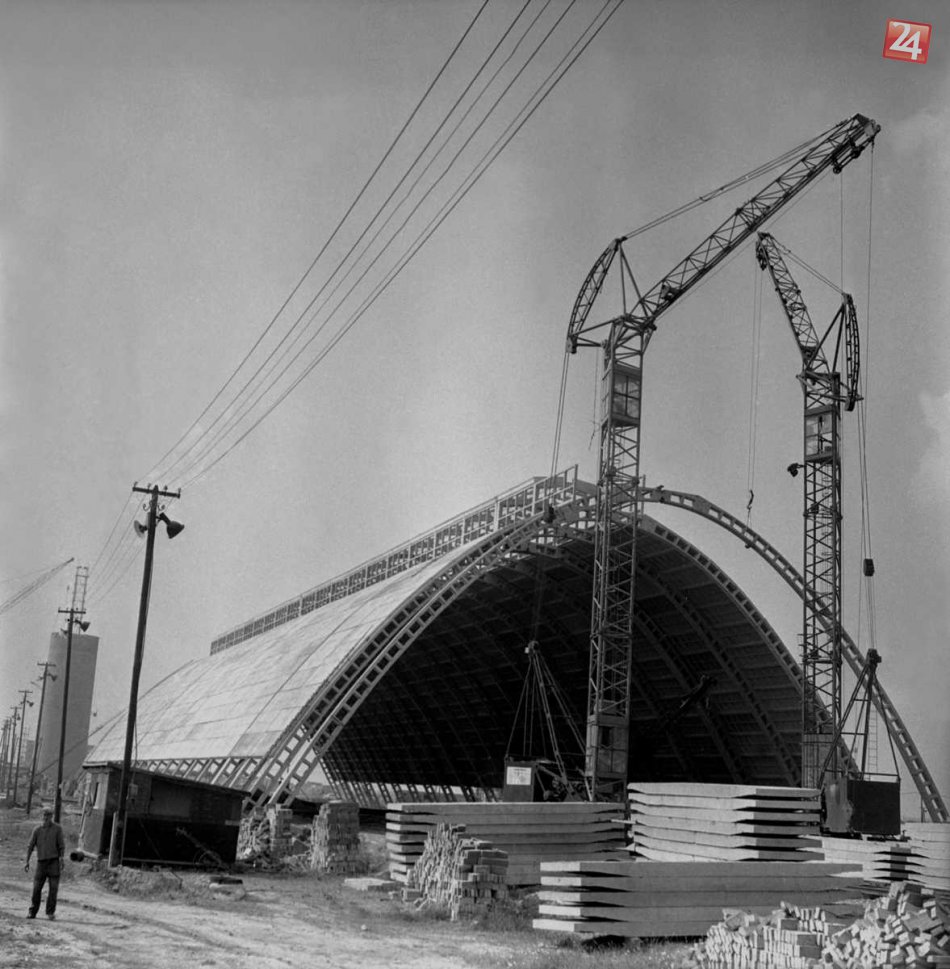 Na archívnej snímke z 1. októbra 1962 pri Košiciach výstavba homogenizačného skladu VSŽ novou stavebnou metódou.