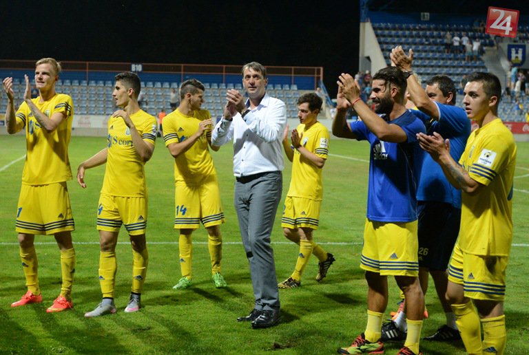 Na snímke uprostred v bielom tréner František Šturma oslavuje s hráčmi MFK Zemplín Michalovce víťazstvo 2:1 v zápase 4. kola futbalovej Fortuna ligy MFK Zemplín Michalovce.