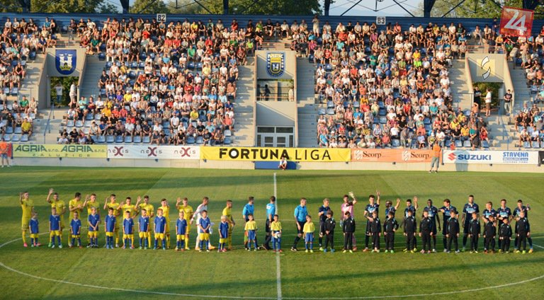 Hráči MFK Zemplín Michalovce, vpravo hráči ViOn Zlaté Moravce.