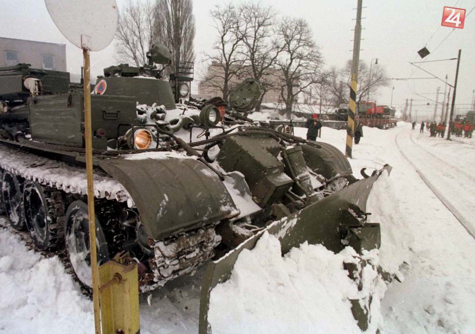 Na pomoc v boji so snehovou kalamitou presunuli do Košíc 13. februára 1999 l. špeciálnu rotu 72. záchrannej brigády CO zo Žiliny. Na snímke tank uvoľňuje zaviaty priechod cez koľaje hneď po vyložení v košickom rušňovom depe.