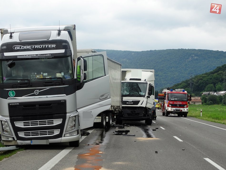 Galéria k článku Zrážka kamiónov a dodávky neďaleko Vidovej: Hasiči museli vyprostiť človeka! FOTO