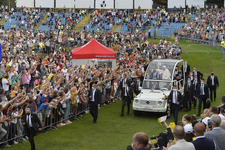 Galéria k článku Pápež František na štadióne Lokomotíva rozdával úsmevy: Vítali ho tisíce mladých, VIDEO