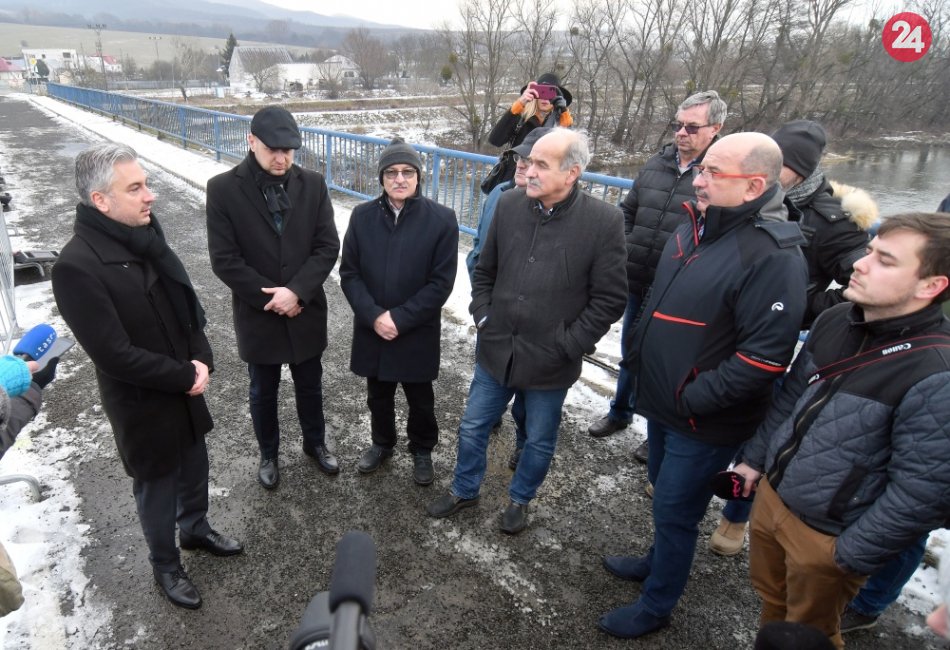 Na snímke vľavo predseda Košického samosprávneho kraja (KSK) Rastislav Trnka v diskusii s obyvateľmi na poškodenom moste cez rieku Laborec medzi mestom Strážske v okrese Michalovce a miestnou časťou Krivošťany počas kontrolného dňa,