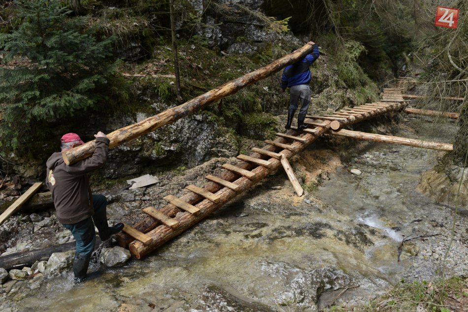 Galéria k článku Čulý pracovný ruch v Slovenskom raji obrazom: Drevo do rokliny Suchá Belá musel dopraviť vrtuľník