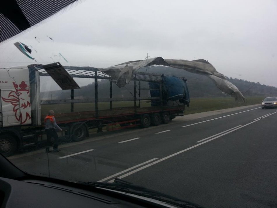 Galéria k článku Takto to vyzeralo dnes na cestách: Silný vietor strhol plachtu z kamióna