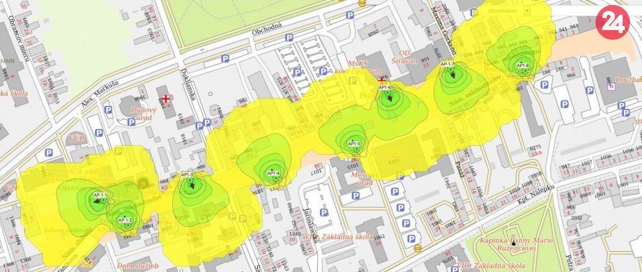 Predpokladané pokrytie budúcej wifi siete „WIFI PRE TEBA“ v centrálnej mestskej zóne mesta Michalovce na základe umiestnenia 8 externých prístupových bodov.