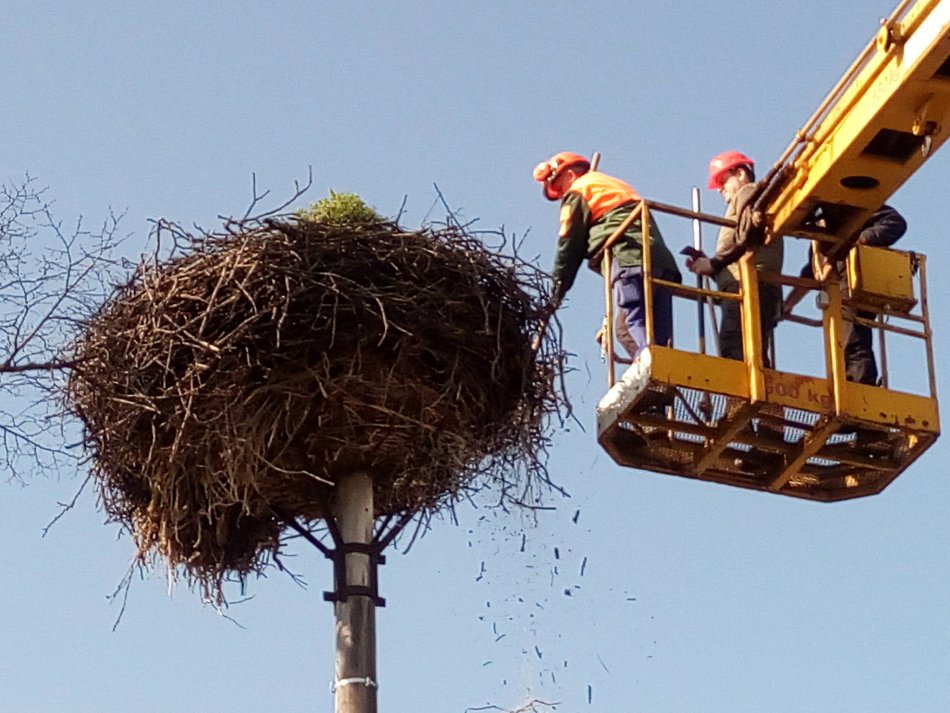 Galéria k článku Vtáci naň použili aj prekvapivý materiál: V obci sa upravovalo 600-kilové bocianie hniezdo
