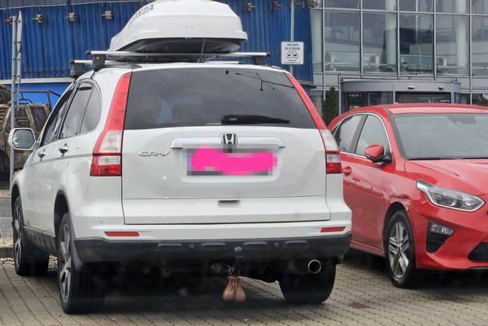 Na ťažné zariadenie niekto zavesil naplnené vrecúška a treba uznať, že výsledný efekt v podobe „mužskej výbavy“ vyznie naozaj vtipne.