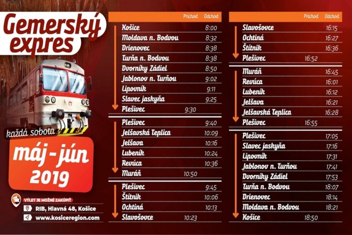 „Gemerský expres bude premávať každú sobotu od 4. 5. do 22. 6. 2019 (vrátane) s ranným odchodom o 8:00 hod. z košickej železničnej stanice. V stanici Plešivec sa súprava rozpojí a cestujúci si môžu zvoliť, ktorým smerom budú pokračovať – buď na Slavošovce, alebo Muráň. Cestujúci si tak môžu naplánovať aj viacero sobôt a objavovať nespočetné množstvo zaujímavých zákutí, ktoré táto lokalita ponúka,“ doplnila výkonná riaditeľka Košice Región Turizmus Lenka Vargová Jurková. Návrat do Košíc je o 18:50 hod.