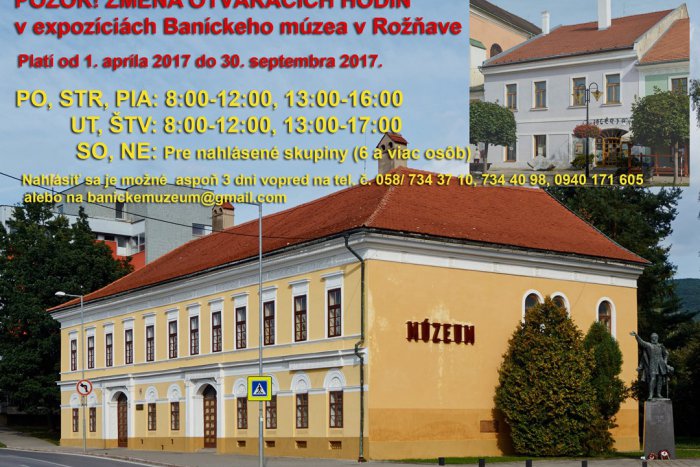 Banícke múzeum v našom meste upravilo otváracie hodiny. Nastala tak zmena. Ako informoval Pavol Horváth z oddelenia propagácie, dovoľujeme si upozorniť na zmenu otváracích hodín v expozíciách Baníckeho múzea: Historická expozícia – prezentačný múzejný depozitár, Šafárikova 31, 048 01 Rožňava a Galéria Baníckeho múzea v Rožňave, Námestie baníkov 25, 048 01 Rožňava.
