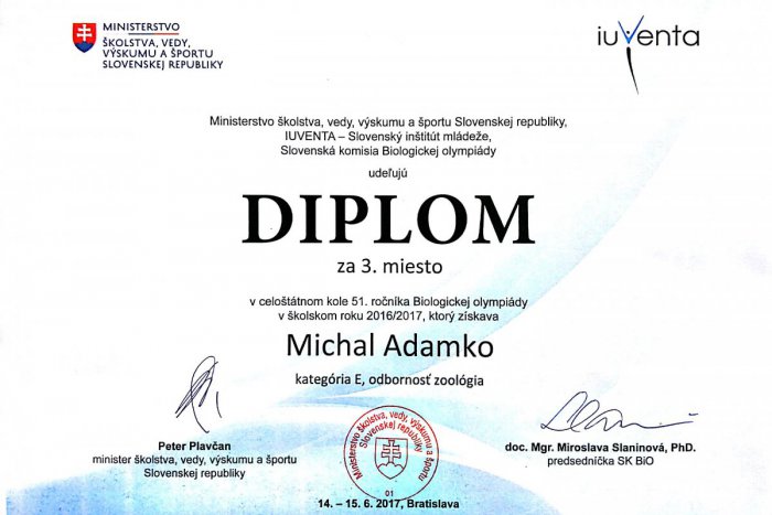 Mišo Adamko, žiak 6.C triedy zo ZŠ Zakarpatská 12 v Rožňave, nás nesklamal ani na celoslovenskom kole biologickej olympiády kategórie E v odbore zoológia. Ako informovala Eva Bystrická, v konkurencii najlepších zoológov, víťazov krajských kôl BIO E sa umiestnil na výbornom 3. mieste a doniesol si bronzovú medailu.