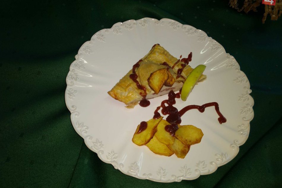Suroviny: kuracie prsia, plesňový syr, slanina, vajíčko, lístkové cesto, prosciutto, brusnicová omáčka